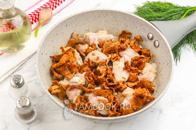 Затем отожмите лисички, если использовали размороженные. Нарежьте их и добавьте в сковороду. Обжарьте все еще 4-6 минут. Грибы выделят небольшую часть жидкости и потом начнут обжариваться.