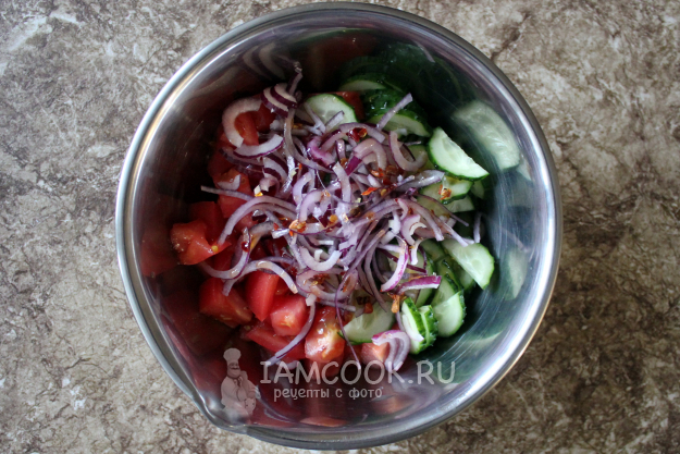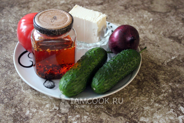 Для острого салата из свежих овощей подготовьте ингредиенты по списку к рецепту. Их количество может варьироваться по вкусу. Острое масло несложно приготовить, залив сушеный перец чили в виде хлопьев с семенами горячим растительным маслом, например, оливковым или виноградных косточек. У меня оно обычно на полке со специями стоит и используется для самых разных блюд.