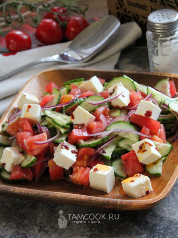 Перемешайте и сопроводите салат сверху кусочками брынзы или феты. Прицельно полейте сыр второй частью заправки. Острый салат из овощей готов.