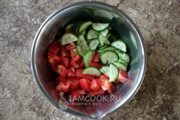 Нарежьте помидор и огурцы кубиком, ломтями или произвольно.