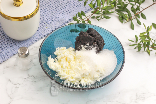 В пиале или креманке смешайте творог с маковой начинкой и сахаром. Если творог суховат, то влейте 1 ст.л. кипятка или добавьте 1 ст.л. сметаны.