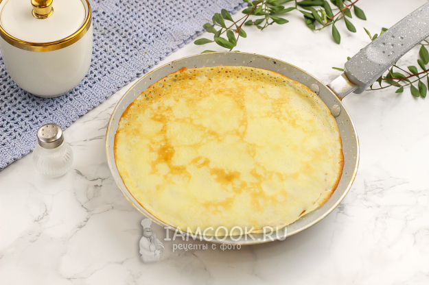 Раскалите сковороду на плите и убавьте нагрев до среднего. Смажьте в первый раз сковороду маслом и налейте половину половника теста. Округлите и испеките блин по минуте с каждой стороны до румяности. Выложите на тарелку и следом точно так же обжарьте и остальные блины.