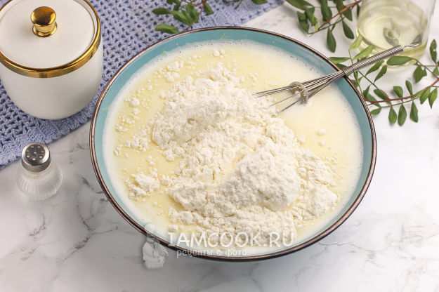Всыпьте по частям пшеничную муку высшего сорта и вмешайте ее венчиком, но не взбивайте, чтобы не образовались комочки. После муки влейте масло, перемешайте и дайте тесту постоять при комнатной температуре 15-20 минут.