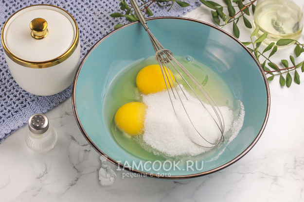 Куриные яйца вбейте в глубокую емкость, всыпьте соль и сахарный песок. По желанию можно добавить ванильный сахар. Тщательно всё взбейте 2-3 минуты.