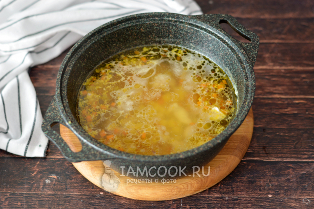 Накройте кастрюлю крышкой и после закипания варите суп на небольшом огне 10-15 минут, чтобы картофель стал мягким.