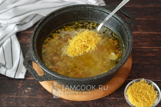 Когда картофель станет мягким, всыпьте в суп вермишель, перемешайте, чтобы она не слиплась.