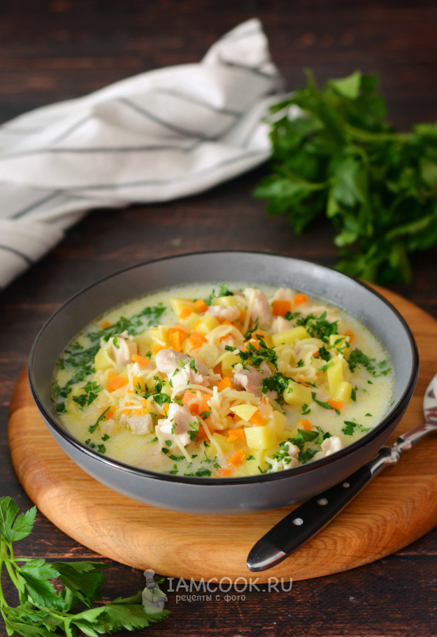 Соберите все необходимые продукты для приготовления сливочного супа с вермишелью и курицей.