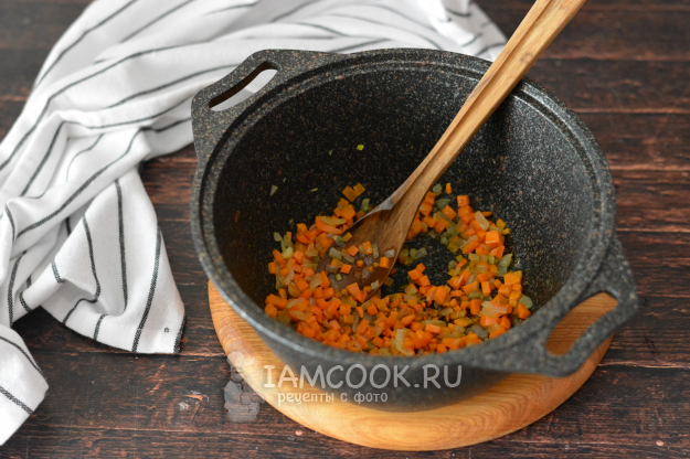 Готовить такой суп удобно в казане, в нём можно сразу обжарить овощи и потом продолжить варку. Вместо казана подойдёт любая толстостенная кастрюля.