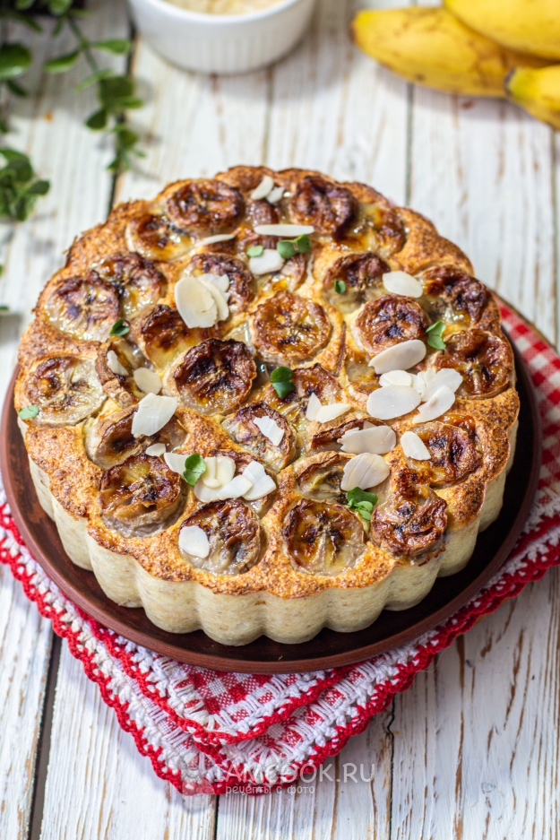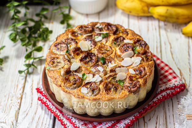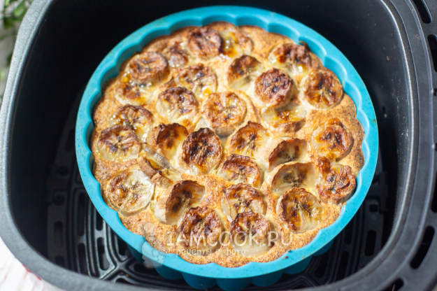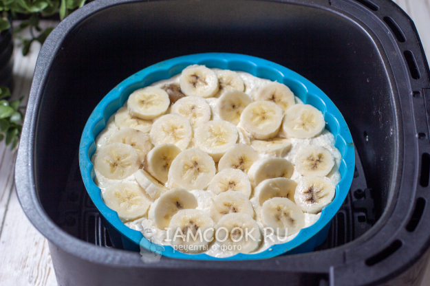 Установите форму в чашу аэрогриля. Два средних банана очистите от кожуры, мякоть нарежьте кружочками. Уложите нарезанный банан на запеканку, слегка их утапливая. Установите температуру 160 градусов, время приготовления - 30 минут. Готовьте творожную запеканку с бананом в аэрогриле до сигнала.