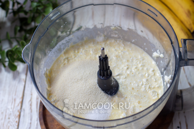 Количество сахара регулируйте на ваш вкус, но не забывайте, что в запеканку мы добавим парочку сладких бананов, которые тоже придадут сладость готовой запеканке. Куриные яйца я добавила крупные, поэтому их три, если у вас мелкие или средние, то добавьте четыре.