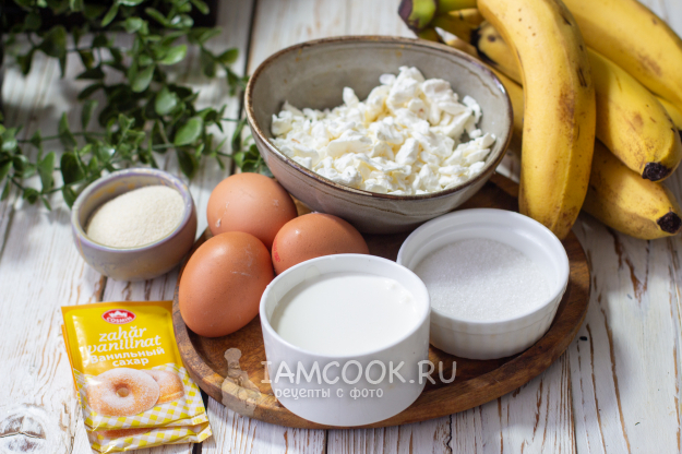 Соберите необходимые продукты для приготовления творожной запеканки с бананом в аэрогриле.