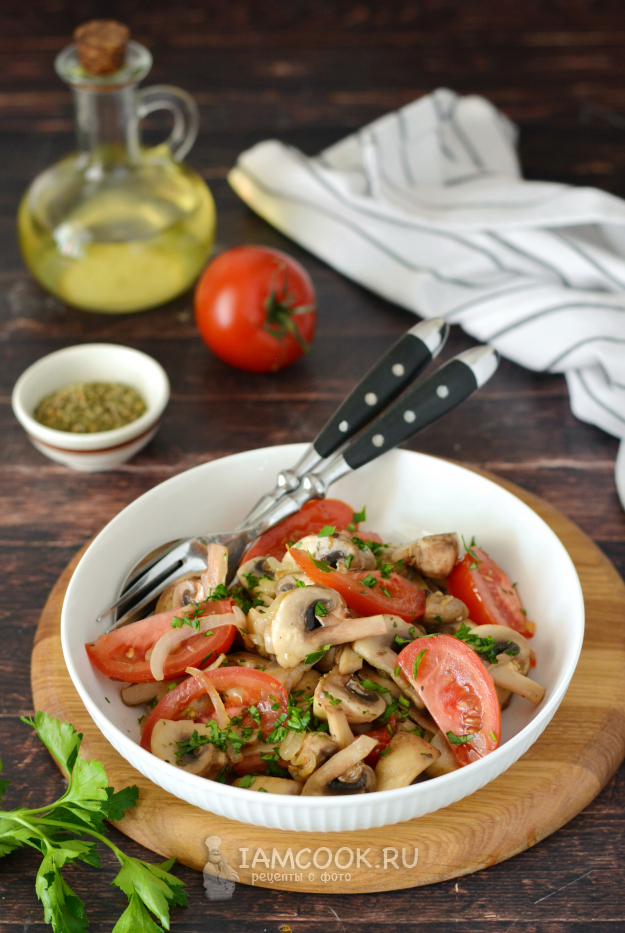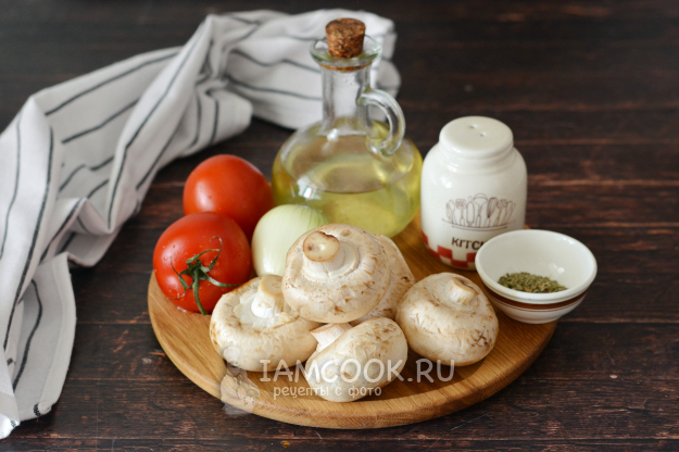 Соберите все продукты и приступим к приготовлению шампиньонов с помидорами на сковороде.