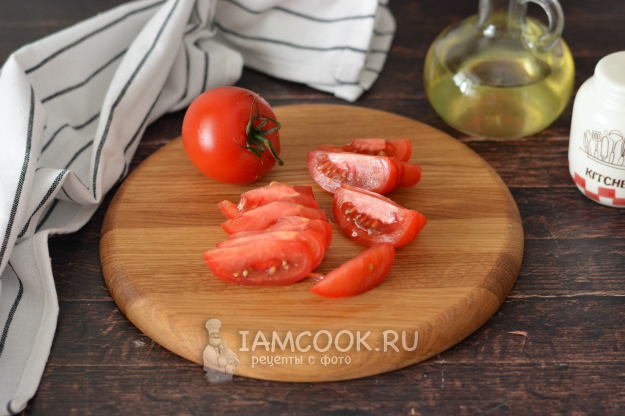 У помидоров удалите плодоножку и нарежьте дольками. Для этого блюда важно брать плотные помидоры, например сливовидные.