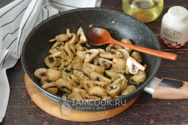 А теперь прибавьте нагрев и выложите в сковороду кусочки шампиньонов. Обжаривайте их 5-7 минут, до появления первых румяных бочков. Сильно зажаривать не нужно и готовить долго тоже не нужно, шампиньоны должны остаться хрустящими.