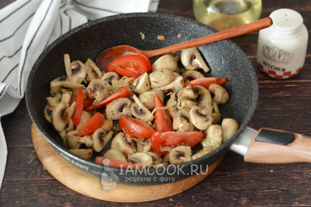 Затем добавьте в сковороду дольки помидоров и прогрейте их 10-15 секунд. Важно, чтобы помидоры не начали готовиться, иначе они потекут. Помидоры должны сохранить форму.