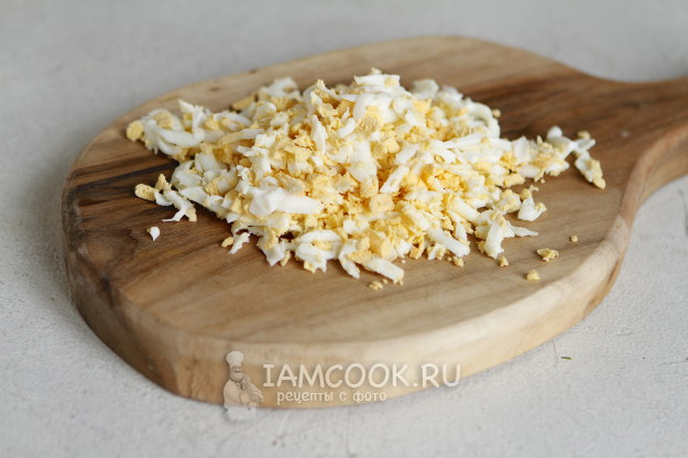 Яйца куриные отварите вкрутую, остудите и почистите.