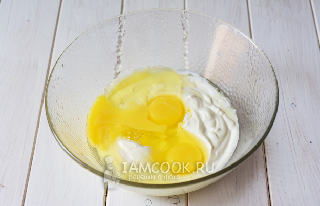 В отдельную миску выложим сметану, вобьем яйца. Перемешаем.