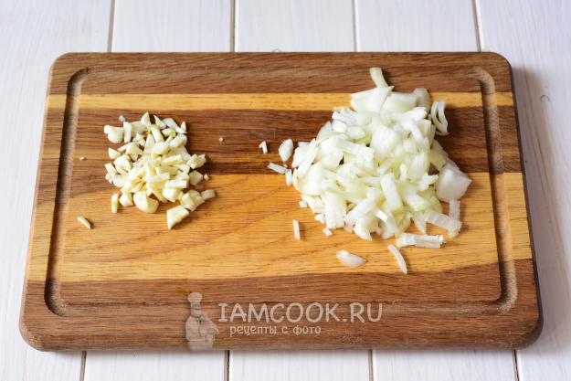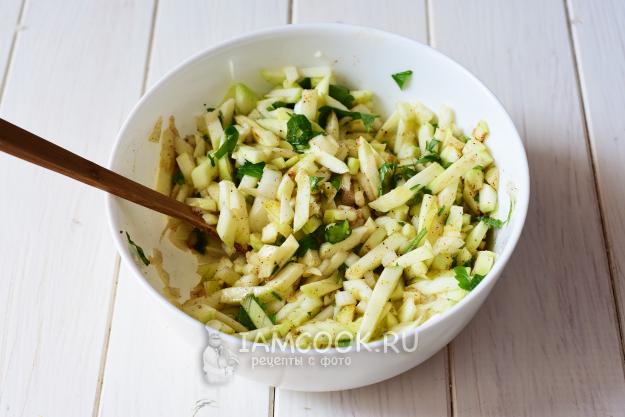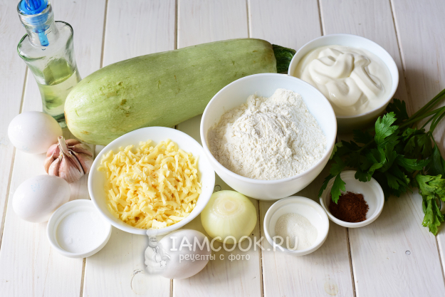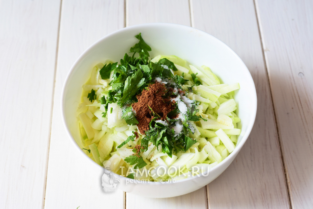 В миску к измельченному кабачку добавим лук, чеснок, петрушку, мускатный орех и соль.
