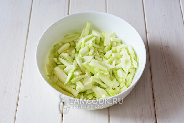 Мякоть кабачка натрем на овощной терке или нарежем брусочками, выложим в просторную миску.