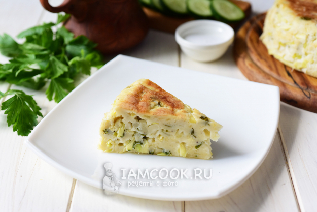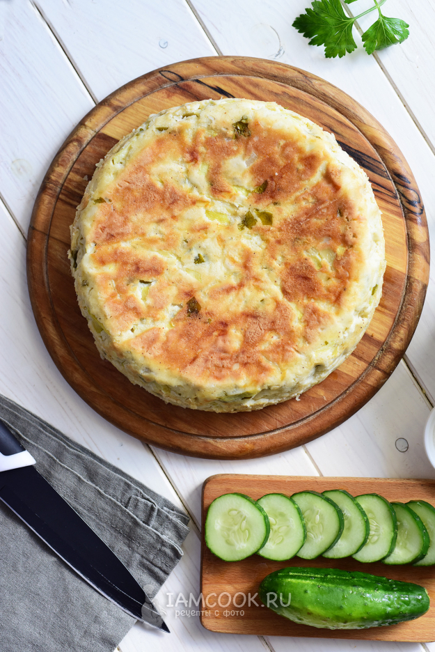 Готовый пирог охладим в чаше, затем чашу накроем плоским блюдом и, перевернув, выложим на блюдо готовый пирог из кабачков.