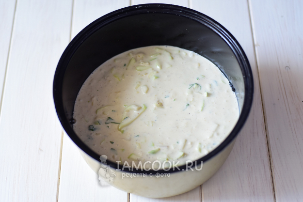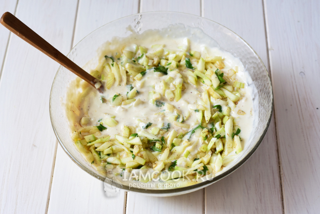 В миску к тесту аккуратно выложим кабачковую массу, с которой предварительно обязательно сольем излишнюю жидкость, и тертый на крупную терку сыр. Перемешаем.