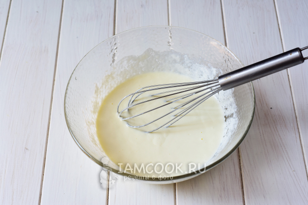 Добавим муку и разрыхлитель и вновь перемешаем. Должно получиться тесто по консистенции, как на оладьи – густо стекать с ложки.