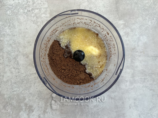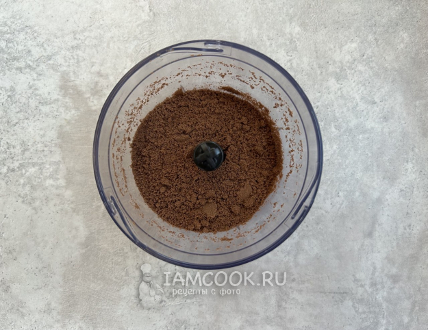 Сложите печенье в чашу блендера и измельчите его в мелкую крошку.