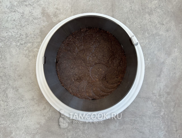 Выложите массу в форму. Хорошо утрамбуйте основу дном стакана, чтобы она стала ровной и плотной. Поставьте форму в холодильник на 30 минут.