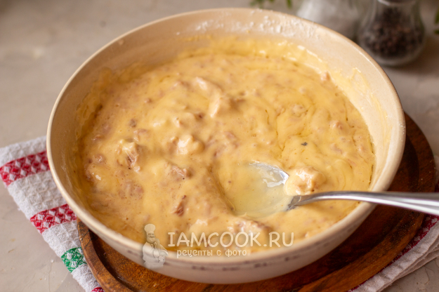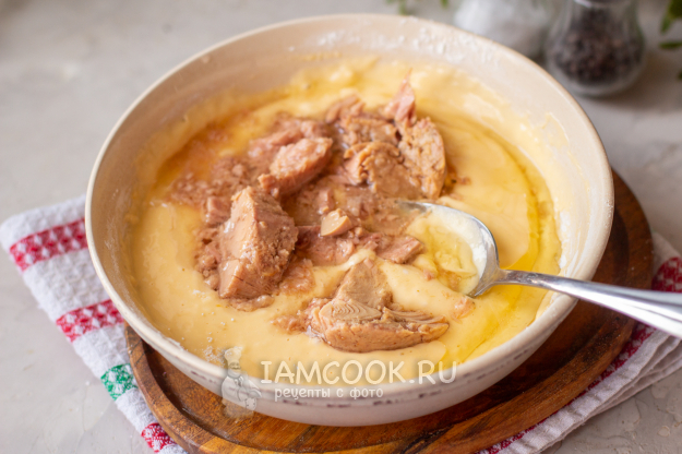 В тесто добавьте тунца вместе с маслом, кусочки рыбы немного разомните вилкой.