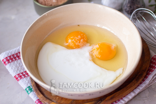 В подходящую посуду вбейте куриные яйца, влейте кефир и добавьте немного соли. С солью не переборщите, так как тунец уже соленый. Соедините яйца с кефиром при помощи венчика.