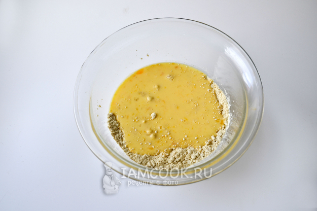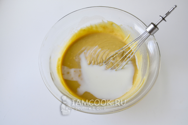 Влейте молочно-яичную смесь в миску с мукой.