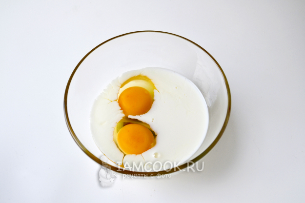 В другую миску налейте молоко и разбейте яйца.
