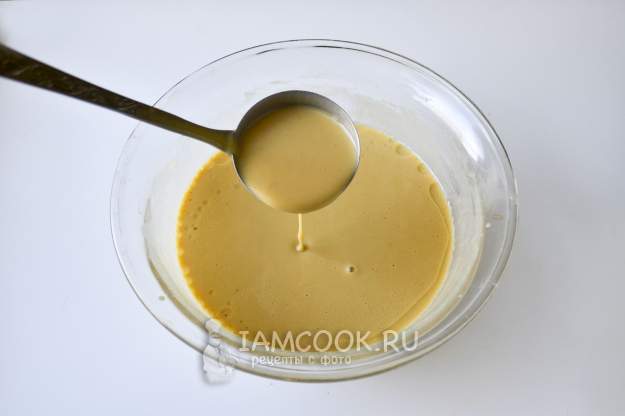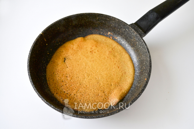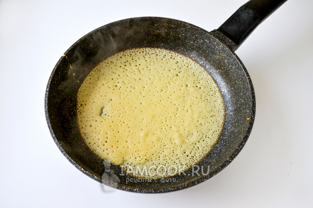 Разогрейте сковороду, капните растительное масло и налейте тесто тонким слоем.