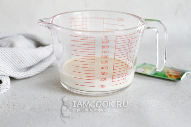 Слегка подогрейте молоко. Растворите в нем соль, сахар и добавьте сухие дрожжи.