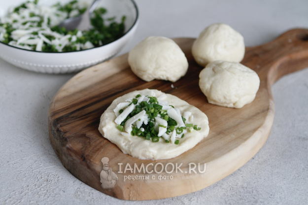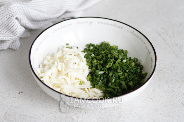 Для начинки нам понадобится любая зелень и сыр. Зелень, в моем случае это лук, промыть, обсушить и мелко нашинковать, сыр натереть на терке. Добавить специи по вкусу, перемешать. Собственно, наша начинка готова.