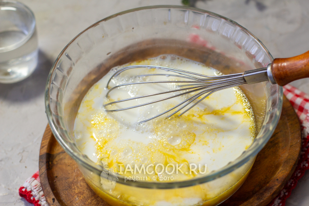 Влейте к яйцам половину нормы молока комнатной температуры. Перемешайте венчиком.