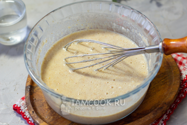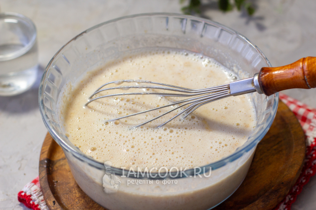 Аккуратно, тонкой струйкой влейте кипяток, при этом непрерывно помешивая тесто венчиком.