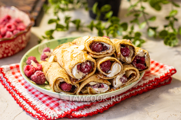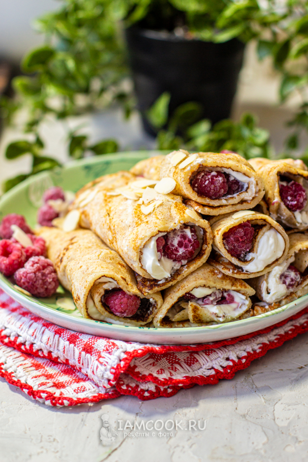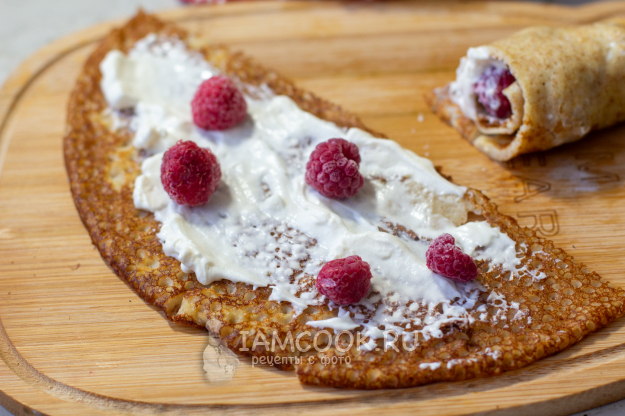 Блины из цельнозерновой муки на кипятке готовы! Подавать их можно пустыми с медом, сметаной или сгущенкой. А можно приготовить как у меня. Разрезать блин на две части. Каждую половину смазать творожным кремом и добавить ягоды, свернуть в трубочки.