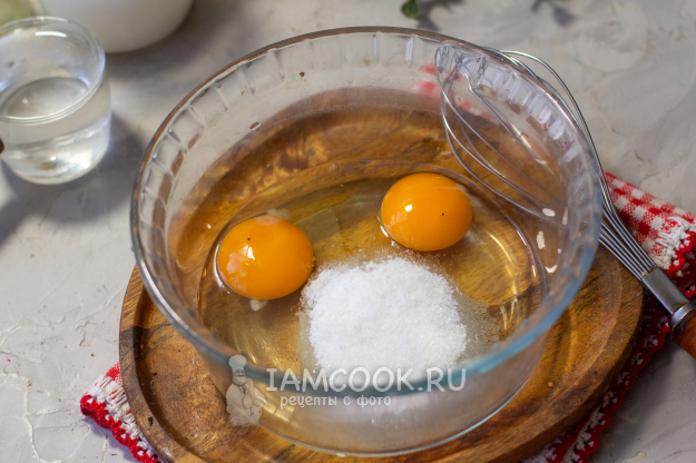 В подходящую посуду вбейте куриные яйца, добавьте соль и сахар. Соедините продукты венчиком до однородности.