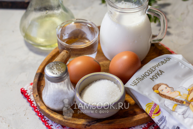 Соберите необходимые продукты для приготовления блинов из цельнозерновой муки на кипятке. Все продукты должны быть комнатной температуры, поэтому молоко и яйца нужно заранее достать из холодильника - примерно за 40-60 минут.