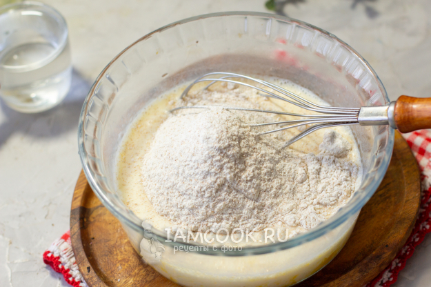 Всыпьте просеянную муку. Просеивать цельнозерновую муку нужно обязательно, причем желательно два раза через мелкое сито. Все хорошо перемешайте венчиком до однородности. На этом этапе все комочки очень хорошо разбиваются благодаря вязкости теста.