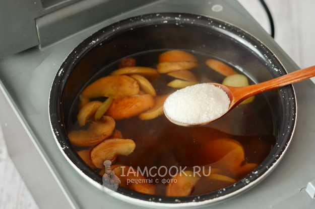 Затем добавьте сахар по вкусу, переведите мультиварку в режим подогрева и оставьте компот ещё на 1 час.