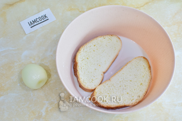 Ломтики батона залейте молоком, чтобы они пропитались. Лук очистите и ополосните.