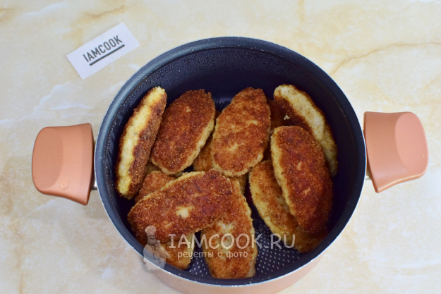 Котлеты из трески с салом станут золотистого цвета. Выложите их в кастрюлю под крышку, чтобы они немного пропарились.