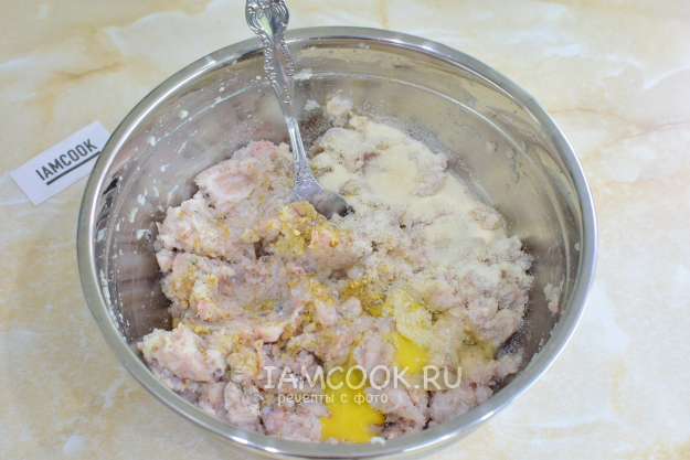 Добавьте в чашу яйцо и манку. Подсыпьте соль и специи по вкусу.