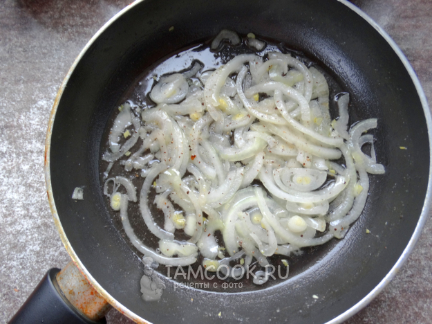 Лук припустить на растительном масле буквально минуту, подсолить и поперчить.
