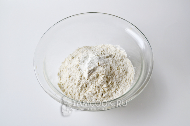 В другую миску просейте муку, добавьте щепотку соли и разрыхлитель. Перемешайте.