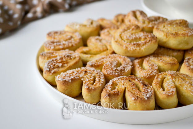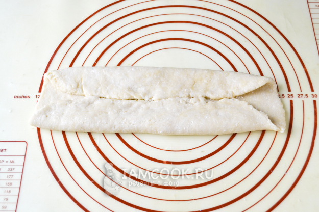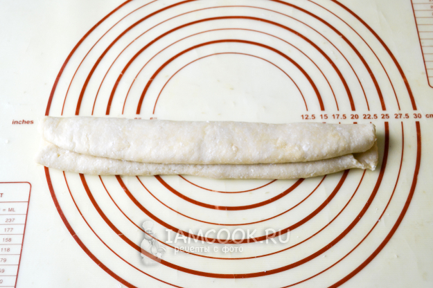 Раскатайте скалкой тесто на столе в прямоугольный пласт примерно 15х25 см, толщиной 5 мм. Посыпьте пласт сахаром.