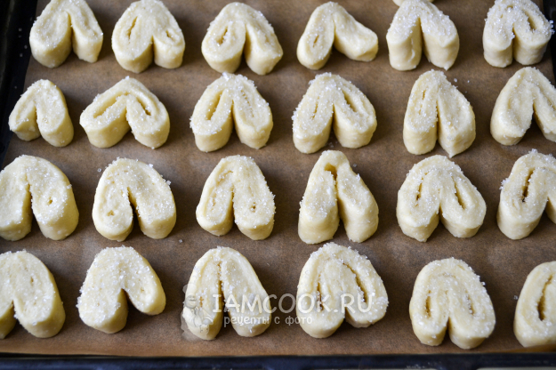 Уложите заготовки сахарной стороной вверх на противень, застеленный пекарской бумагой.