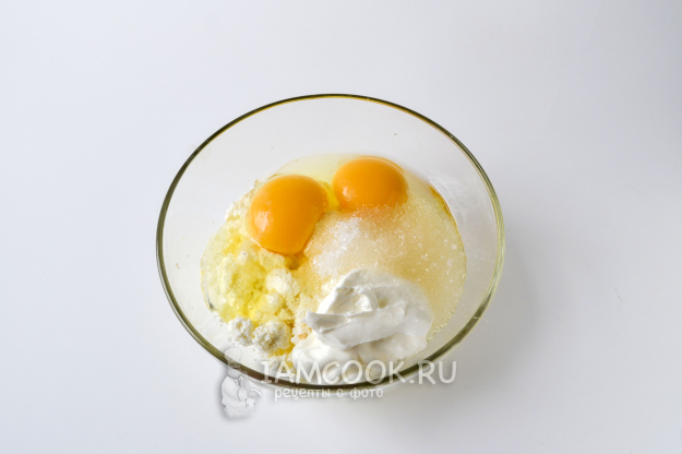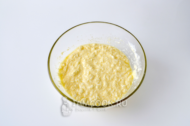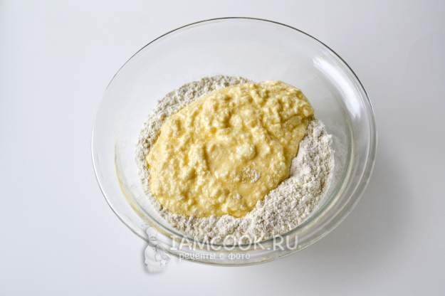 Переложите творожную смесь в миску с мукой. Сначала перемешайте продукты ложкой.